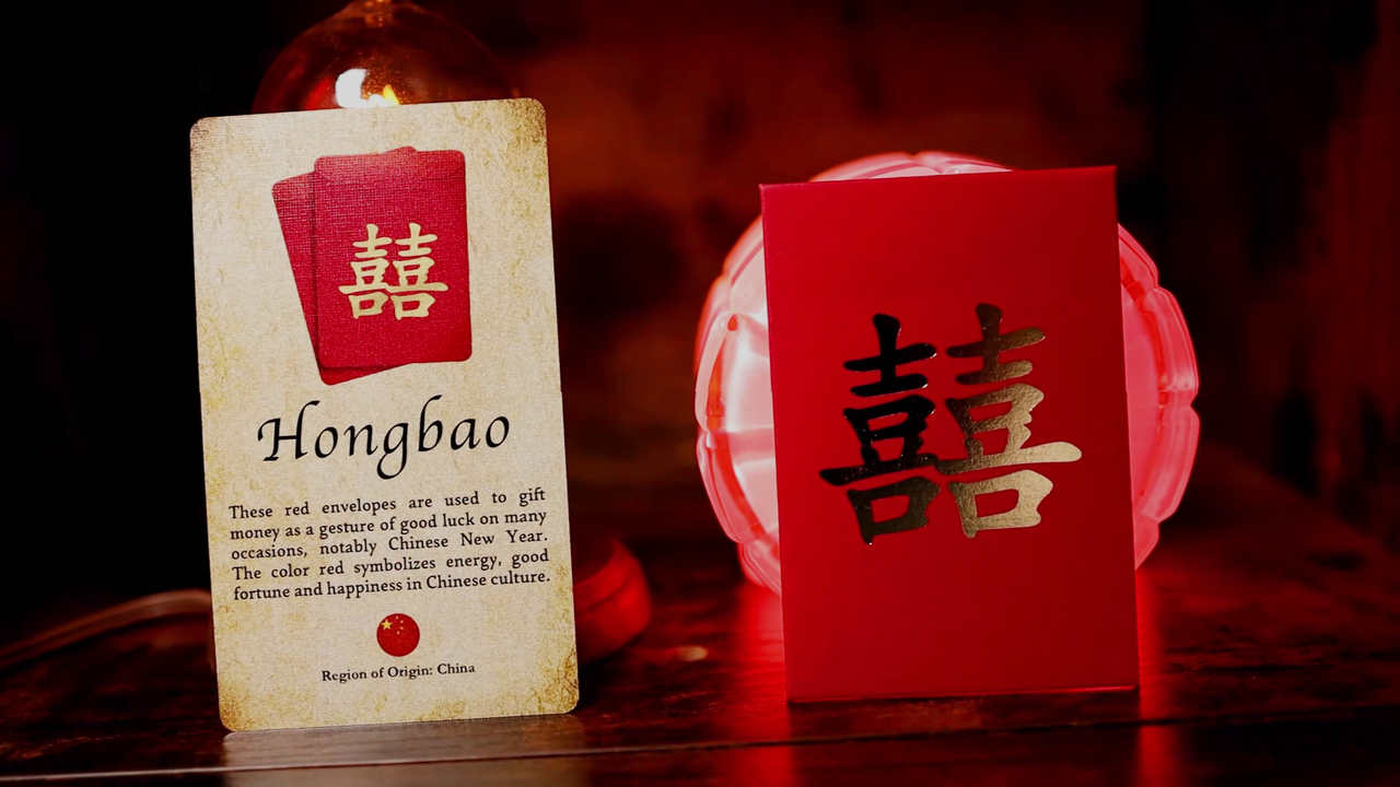 Dès le début, une enveloppe Hongbao est placée sur la table. Un porte-bonheur est choisi librement. L'enveloppe est vide, car elle est elle-même un porte-bonheur, symbole de la chance chinoise.