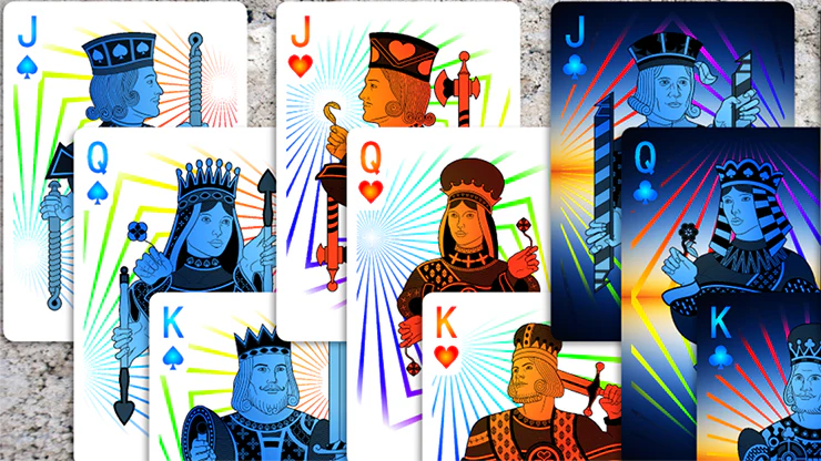 Les cartes sont imprimées avec une finition diamant de haute qualité et une couche de brillance spéciale. Leur coffret personnalisé et joyeux présente également un brillant complexe. Idéal pour une performance de magie ou de cardistry éclatante ! Chaque jeu est scellé avec un hologramme personnalisé.