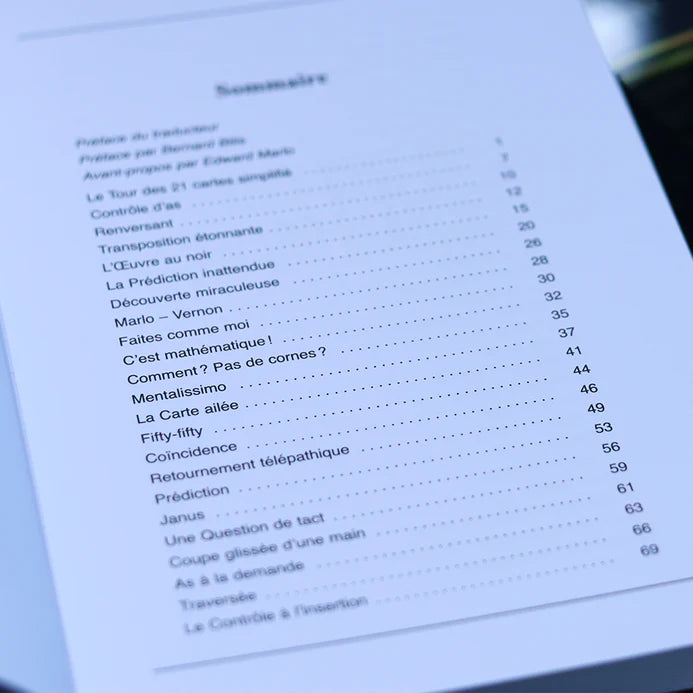Le tour des 21 cartes simplifiées – Renversant – Transposition étonnante – Marlo-Vernon – Faites comme moi… – C'est mathématique ! - Commentaire ! Pas de cornes ? – La Carte ailée – Cinquante-cinquante – Coïncidences – Retournement télépathique – Prédiction – Janus – Le Sens du toucher – Coupe glissée d'une main – Pénétration – Le contrôle à l'enfoncement – Pique et Pique et Colégram – Sympathie – Stop nec plus ultra – Faites un vœu – Prélude en As majeur – Maîtres et Valets – Triomphe à la Marlo – Une routine d'As toute simple – As et nombre – Les As Pharaon – Contrôle d'une main – Les As de Marlo – Estimation mécanique – Le 7 magique – Découverte pharaonique – Deux découvertes – Fausse donne – Contrôle d'As – Contrôle automatique – Placement exact – Le Repos du Guerrier – Deux problèmes – L'œuvre au noir – Contrôle d'As – La Prédiction inat-tendue – Miracle location – La Carte pensée – Le Mystère des 7 suspects – Marlo parle du Christ – Double location – Le Chapelet perpétuel – La Carte pensée – Le voyage invisible – Télépathie – L'heure anticipée – L'Heure ex-acte – Le Spectateur coupé sur les As – Le Fermier et les voleurs de poules.