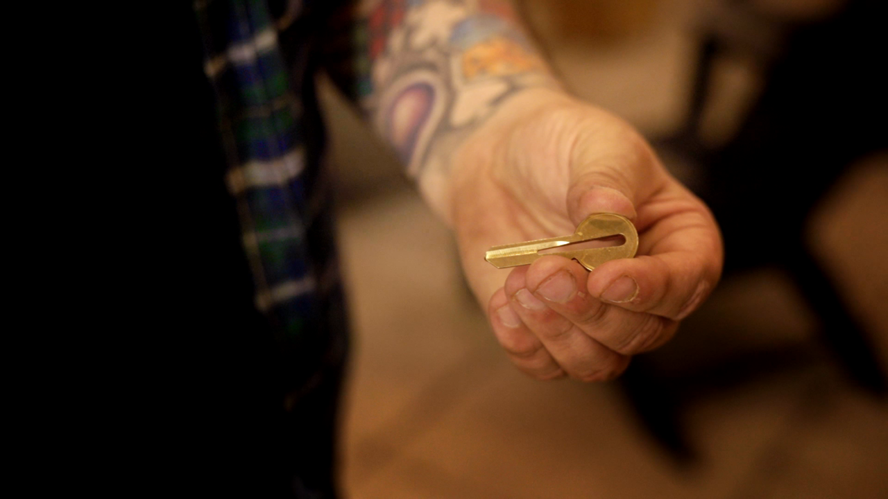 Stretch the hole in a SOLID METAL KEY, and pass a LARGE coin through it. THE PERFECT ACCESSORY TO KEYMASTER.