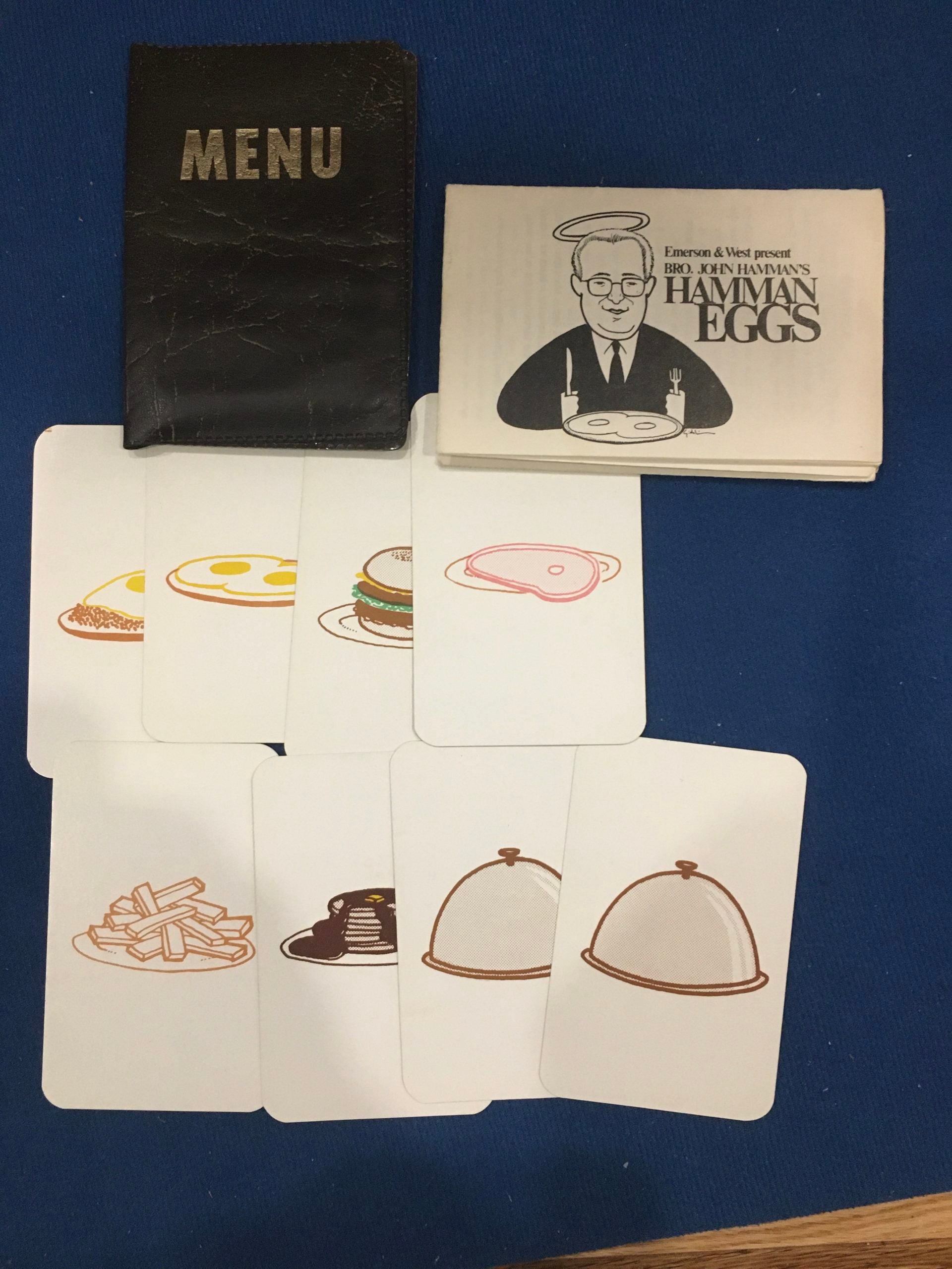 The magician relates the frustrations of two hungry people who try in vain to order a simple meal of ham and eggs. The waitress invariably gives one of them two orders of eggs and the other two orders of ham. Finally and magically, the ham and eggs change into an order of hamburgers and French fries for both customers!